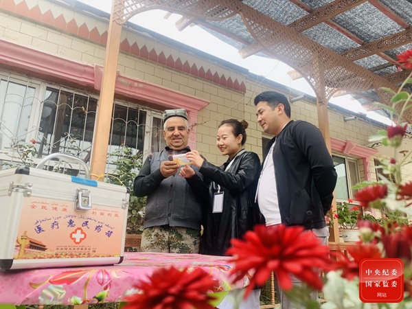 新疆维吾尔自治区阿克苏市纪检监察干部通过走访入户、谈心谈话,了解贫困户医疗惠民药箱及慢性病药、生活常规药品发放情况,确保国家各项医疗惠民政策落到实处。(新疆维吾尔自治区阿克苏市纪委监委 安艳艳 摄)