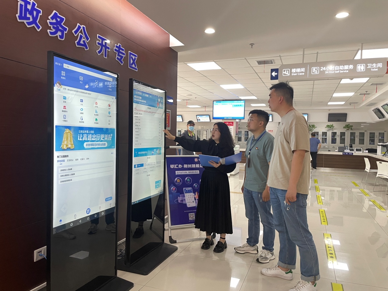 该市沙市区纪委监委工作人员正在辖区政务服务大厅进行“体验式”监督