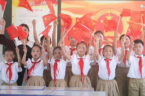 双节来临之际,宜城市实验小学举办爱国主题教育活动。学生们高高挥舞的小国旗,连成一片流动的“红海”,与鲜红的小脸交相辉映。(邬玲玲供图)