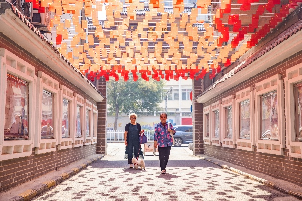 国庆隆重热烈,生活恬淡美好。樊城区水星台社区廉洁文化长廊上空国旗飘扬,老人悠闲的身影与周围的国旗相互映衬,尽显岁月静好。(张沛供图)