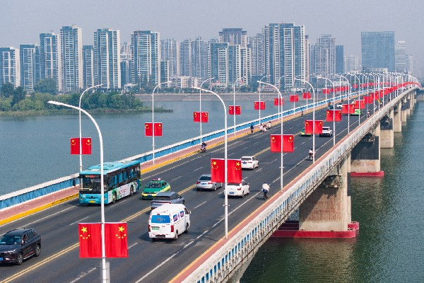 远处高楼鳞次栉比,近处国旗猎猎飘扬。“桥宽路美”见证着古老城市的变迁,飘扬的国旗诉说着现代发展的自豪。(杨东供图)