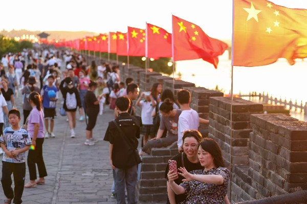 襄阳古城墙作为著名文化地理标志,双节前夕吸引不少群众过来打卡。每一张笑脸汇聚在一起,就是一幅国泰民安的最美画卷。(杨东供图)
