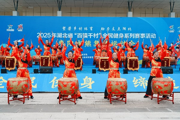铿锵鼓点敲出乡村活力,《盛世欢歌》奏响国庆乐章。2025年湖北省“百镇千村”全民健身系列赛事活动在枣阳市熊集镇火热启幕,村民们在家门口享受体育盛宴。(贺尘然供图)