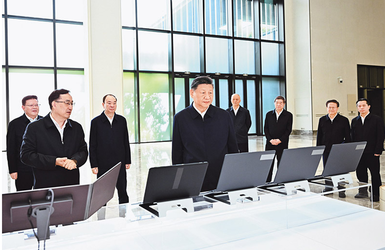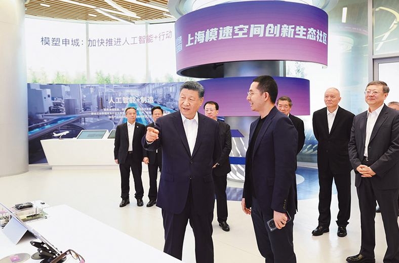 2025年4月29日,中共中央总书记、国家主席、中央军委主席习近平在上海考察。这是习近平在位于徐汇区的上海“模速空间”大模型创新生态社区,察看大模型产品展示。 新华社记者 王晔/摄