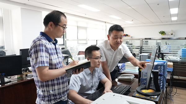图为黄石市纪委监委干部联合市社保局工作人员运用大数据监督模型排查疑点问题。