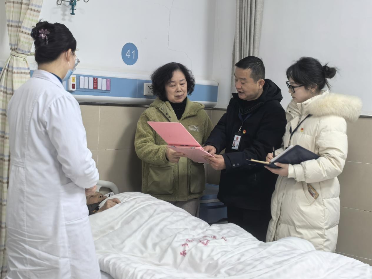 云梦县纪委监委紧盯重复医疗检查领域,联合县卫健局组建监督检查工作专班,深入各医疗机构,通过查阅资料、明察暗访、走访患者,深挖细查侵害群众利益问题,守护群众看病就医“钱袋子”。图为该县监督检查组到城区医院,走访了解群众就医情况。
